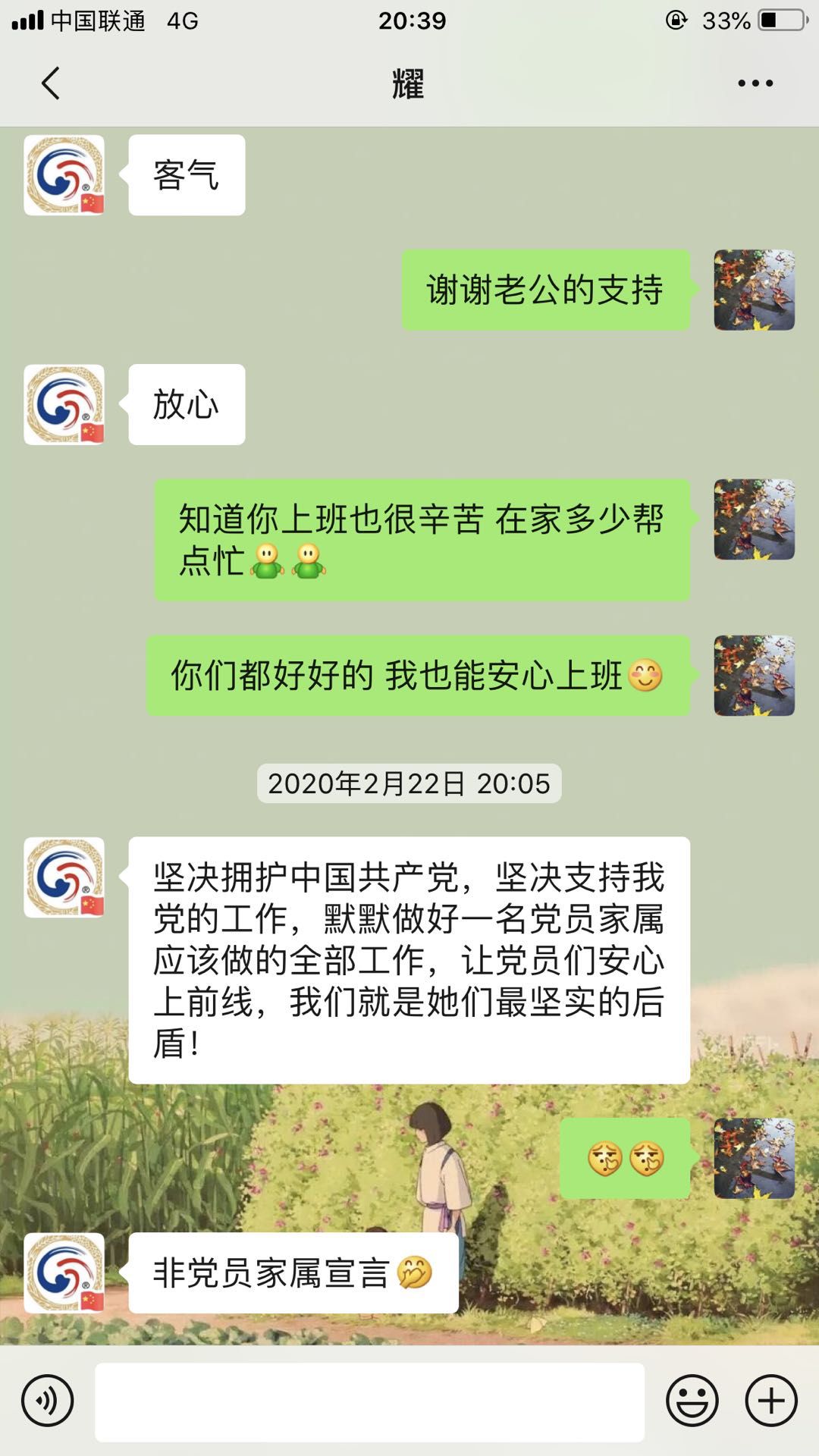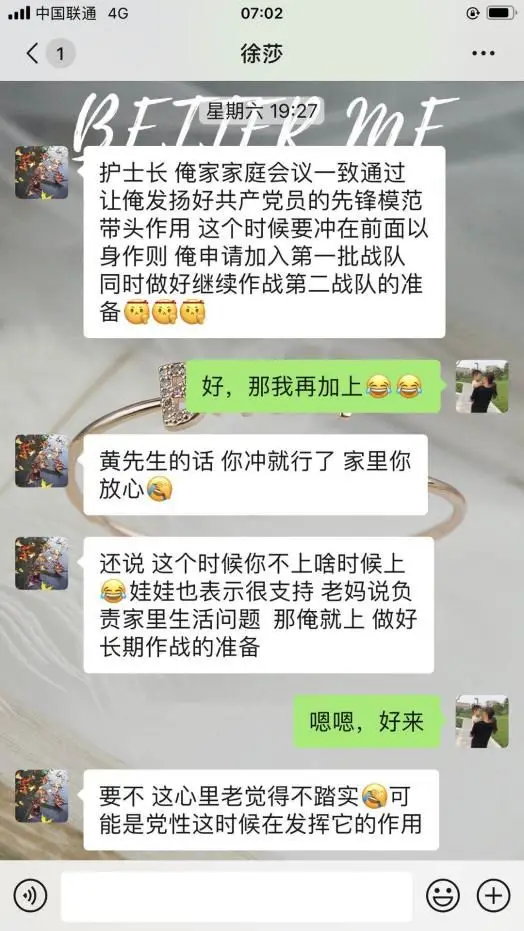 给先生发了微信,一分钟,两分钟没有回信,等不及了,打过电话去,简单说明意图,人家干脆利落地回话:“这个还用征求啥意见,你往前冲就行了!这个时候你不上啥时候上?亏你还是个党员呢!家里不是还有我吗?你就放心就行了!”妥了!有我们家甩手掌柜的这句话,我还有什么可担心的?再后来一向不怎么有正形的先生一本正经地发表了他的非党员家属宣言——“坚决拥护中国共产党,坚决支持我党的工作,默默做好一名党员家属应该做的全部工作,让党员们安心上前线,我们就是她们最坚实的后盾!”我相信有很多人,第一次看到这份所谓的非党员家属宣言,会和我一样用这样的两个表情来回复,感觉这个人有些许刻意的“做作”“惺惺作态”,甚至让人心生“嫌弃”,但嫌弃之余,是更多的感恩和欣慰,因为我知道这一刻,这是真正的心声,更是一份坚定和承诺。而我能做的,就是心无杂念,义无反顾,奔赴战场! 提前一天给奶奶理了发,备足米面蔬菜肉、药品,充上水电,一遍遍叮嘱好了她和杨阿姨一定注意身体,没事别出门,有事打电话。奶奶虽然已九十多岁,却头脑清晰明事理,疫情当头不含糊:“孙媳妇,知道你是党员,得带头,我和你杨姨你放心就行了,你好生上班,没有啥事我就不给你打电话,不给你添麻烦,你在病房里一定自己多注意啊!”给我深明大义的奶奶点个赞!