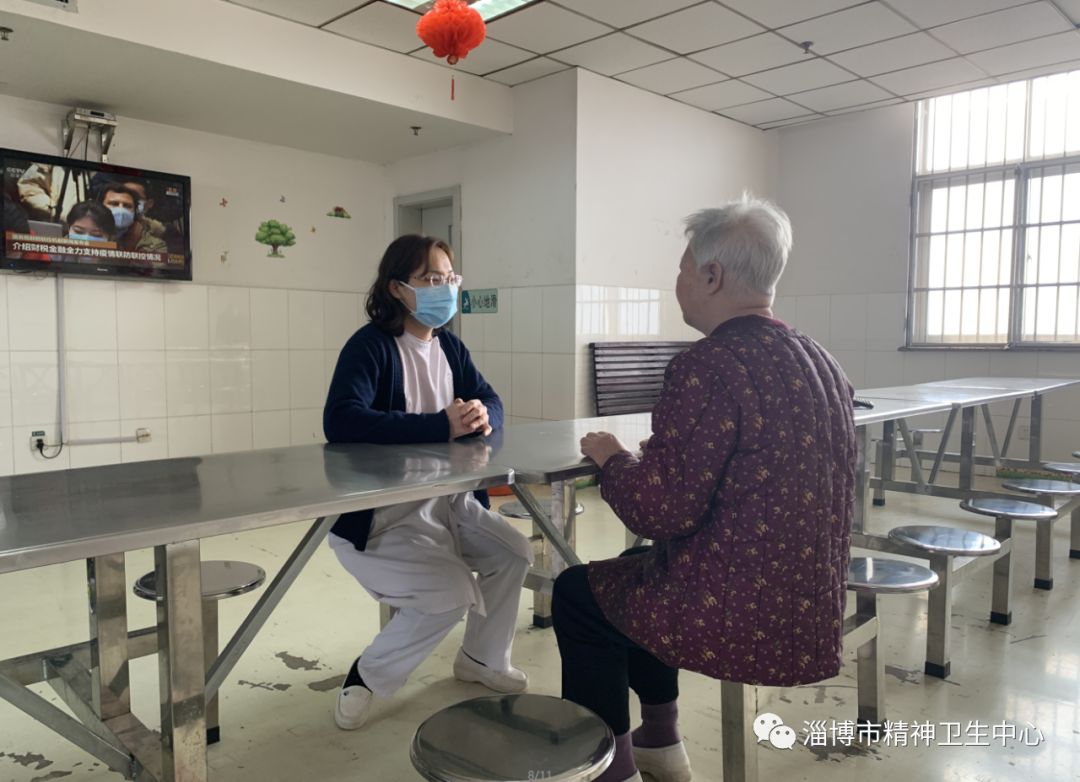 在淄博市精神卫生中心老年心身科,部分家属与患者约定好接他们回家过年,但是这个约定却落空了,让一种叫“新型冠状病毒”感染的疫情挡住了他们回家的路。通过媒体宣传、护士们的讲解,他们对新冠肺炎疫情有了一定的认识。李阿姨因担心家人安全,想出院回家,焦虑到夜不能寐。针对这种情况,我们的护士与她耐心沟通、疏导情绪:“李大姨,现在疫情这么严重,你在咱们医院里,家人孩子们也能安心呀,一会儿你给家人打个电话,她们不能出门也都牵挂着您呢……”之后李大姨眉头舒展开来,“护士你说的对,在这里孩子们才放心,咱不能给家人添麻烦,咱不能给国家添麻烦呐!”