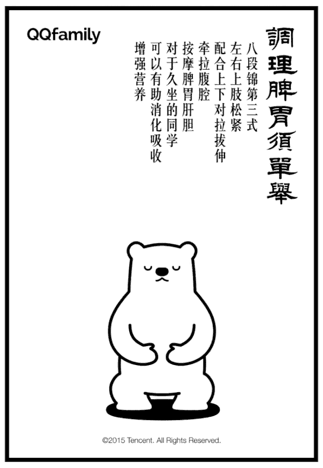 双手交叠置于腹前,男士左手在内,女士右手在内,感受你此刻的呼吸,观察有没有一些节奏、深浅的变化。最后是自然站立一会儿,感受一下你的身体,作为一个整体,站在这里的感觉:你的体温、心跳、呼吸有没有什么变化,还有你的心情有没有变化。1、我们不苛求进步。不强求,不强迫自己去做一些自己还暂时不能做到的动作。2、接纳自己的局限,接纳你自己身体的现状,学会宽容、保护好你自己。