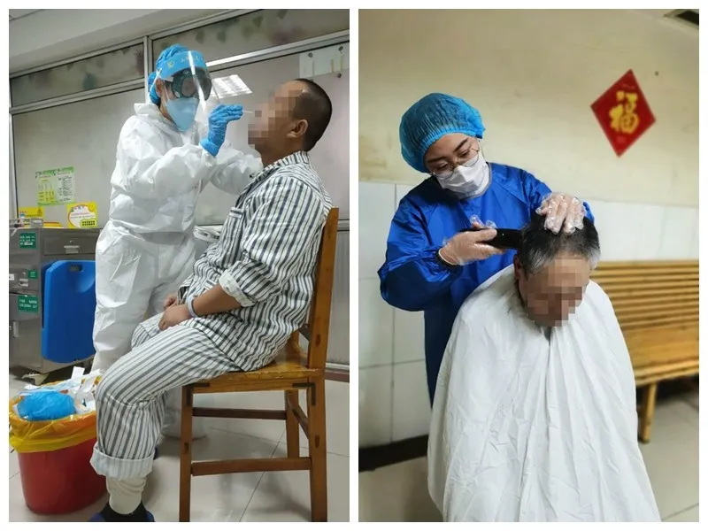 我们的三八班护士现在都是白班加小夜班、或是白班加大夜班这样连轴转,即便是在这样高强度的工作模式下,孔凡旭、李肖东护士等还是在小夜班下班之前把餐厅、走廊都打扫干净、清洁消毒。我们的医护人员多才多艺,角色转换自如,患者头发长了,没有发型了,我们的王佳倩护士又变身为理发师。病区门锁坏了,张坤护士又当起了维修员,一会就把门锁修好了。夜深了,病人都已入睡,夜班护士仍穿梭在病房的每个角落巡视,在确保病人安全的情况下,还不忘书写护理记录。