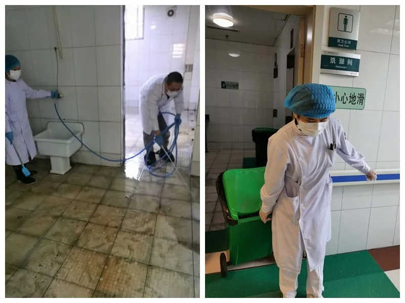 封闭管理第一天,我们王春霞副护士长,崔哲、司书博大夫,不怕脏不怕累,用盐酸冲刷厕所地面,足足干了一上午,王春霞的手上还磨起了两个水泡。病区老弱病人多,坐便器堵塞,无法使用,又不能及时维修,大便时常会弄到便池外边,大家都争抢着去冲刷厕所,先用水管冲刷干净,再用刮水器一点点把水都弄干,大家互相开玩笑的说:“我们专业冲厕所的”,病房有什么脏活累活一起上,抢着干。封闭管理7天以来,医护人员共同努力,为患者创造了一个窗明几净的生活环境,每当看到亮堂堂的房间和走廊,我们倍感自豪。每到发饭时,李洋、刘逸潇、王星戈、高梦鸽四名护士,“型男靓女”秒变发饭员;我们还是心理疏导员和联络员,特殊时期,每天接听家属很多个询问电话,耐心细致的和每一位家属交流;同时也会为不安心住院、有特殊要求的患者做好安抚和联络工作,此时我们的张玉青副护士长又秒变成心理咨询员。