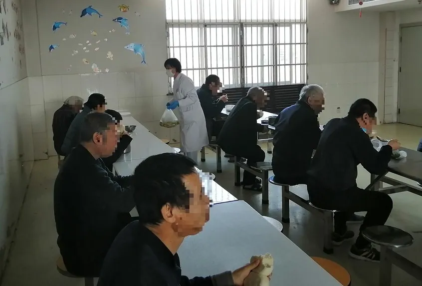 进行分散进餐。患者饭菜统一由医护人员戴手套从病区大门再接入病区分发,阻断其与外来人员的接触,患者在餐厅内分散入座进餐。