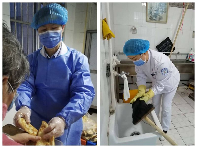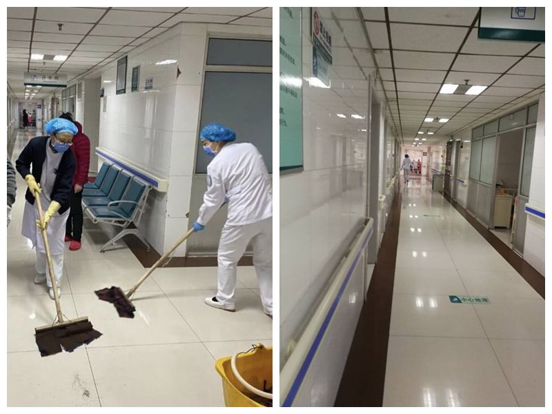 发饭间,路主任正在为病人发饭,病友们自觉的戴好口罩,排队领饭。吃完早饭,杨护士长带领工作人员发动年轻的患者及家属清理病区卫生。“84”消毒液擦拭床头桌、地面,涮洗拖把,冲刷厕所。大约2个小时的清扫工作完成后,整个病区变得整洁舒适、干净明亮。