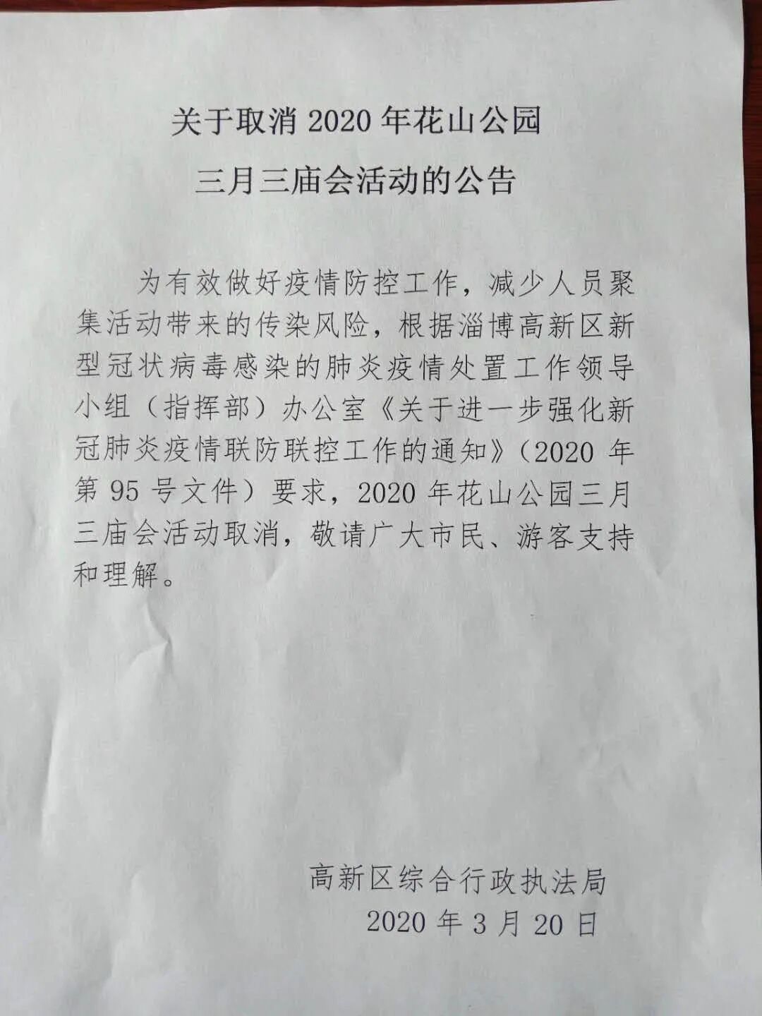 淄博市下发通知,这些机构封闭管理、这类集体活动暂停... 发布时间:2020/4/2 15:36:28文章来源:本站 淄博市民政局下发清明节文明祭扫通知暂停组织群众集体祭扫活动清明节即将来临。记者今日从市民政局获悉,在这个缅怀先辈、寄托哀思的时节,市民政局根据目前新冠肺炎疫情防控工作需要,报经市委新冠肺炎疫情处置工作领导小组(指挥部)同意,为防止人员流动和人群聚集增加疫情反弹风险,我市各殡仪馆、公墓、骨灰堂等殡葬服务机构暂停组织群众集中祭扫、集体共祭、骨灰撒海、节地生态安葬仪式等集体性活动,实行封闭式管理。对新办理骨灰安葬业务的逝者亲属要采取人数限制措施,请广大居民群众了解、理解并给予配合支持。为满足群众祭扫需求,我市部分殡仪馆、公墓、骨灰堂等殡葬服务机构通过网站、移动客户端、微信公众号等方式提供免费网络祭扫服务;部分殡葬服务机构可提供代替祭扫服务,群众可向能够提供代替祭扫服务的公墓提出申请,由公墓工作人员通过擦拭墓碑、敬献鲜花等方式代为祭扫。党员干部要充分发挥党员干部带头作用,自觉摒弃不文明的祭扫方式。不在路边、广场、学校、小区、树林、草坪等公共场所烧纸钱、化冥物,不在林区、景区等禁火区域焚烧纸钱、燃放鞭炮,把实地实物祭扫转移到对逝者的精神文化传承上来。在疫情防控的特殊时期,倡导“少流动、控聚集”,弘扬尊重生命、绿色文明的殡葬新风。3月20日高新区综合行政执法局发布关于取消2020年花山公园三月三庙会活动的公告↓↓↓3月22日,临淄牛山庙会组委会发布消息三月三庙会取消↓↓↓关于取消2020年牛山三月三庙会活动的公告 为有效做好疫情防控工作,减少人员聚集带来的新型冠状病毒肺炎的传染风险,按照上级疫情联防联控的要求,2020年牛山三月三庙会活动取消,敬请广大市民、游客理解和支持。 牛山庙会组委会2020年3月22日来源:大众网淄博(综合鲁中晨报、高新区综合行政执法局) 上一篇:【淄博精卫人的担当】一位哺乳期妈妈的战“疫”心愿 下一篇:使用公筷,从下一顿饭做起! 更多新闻: 淄博市精神卫生中心巡回医疗队赴沂源县开展“党建引领 医疗强基”常态化巡回医疗活动2025/11/28 科普心力量 健康新方向——淄博市精神卫生中心举办2025年健康科普创新创意大赛2025/11/18 一面锦旗映初心2025/11/10 精益求精 质领未来——淄博市精神卫生中心成功举办2025年医疗质量持续改进案例比赛2025/11/03 重阳叙暖阳 森田话安康--临床心理科开展叙事护理联合森田疗法重阳节团体活动2025/11/03 情暖金秋 关爱相伴——淄博市精神卫生中心专家团队赴市老干部活动中心开展重阳节心理关爱活动2025/11/03